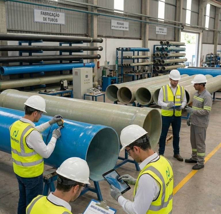 A Newtech realiza inspeções nos fabricantes de tubos de PRFV e RPVC que são utilizados em redes de distribuição de água ou resíduos (vinhaça). Os tubos quando em operação sofrem elevados níveis de pressão e por isso é relevante o acompanhamento por meio de inspeções e a realização de ensaios para que se possa assegurar a qualidade dos mesmos.